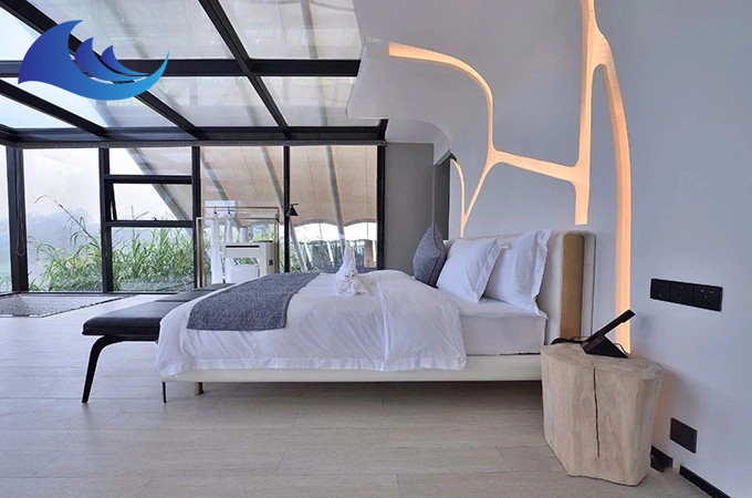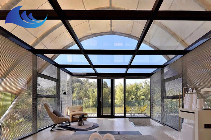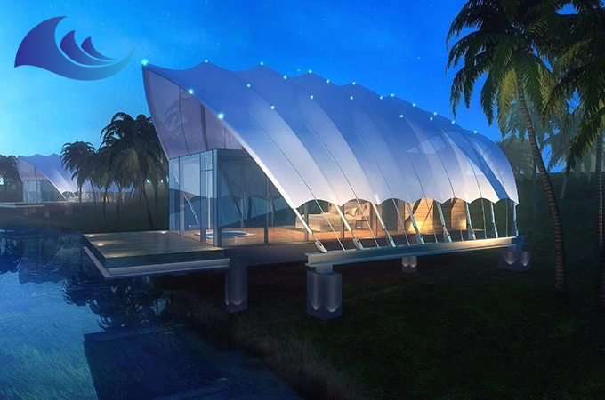帳篷酒店采用高強(qiáng)度中空鋁合金結(jié)構(gòu)或者是鋼結(jié)構(gòu),表面具備有防腐處理,優(yōu)選膜結(jié)構(gòu)頂棚,安全耐用,防水、阻燃、防紫外線。